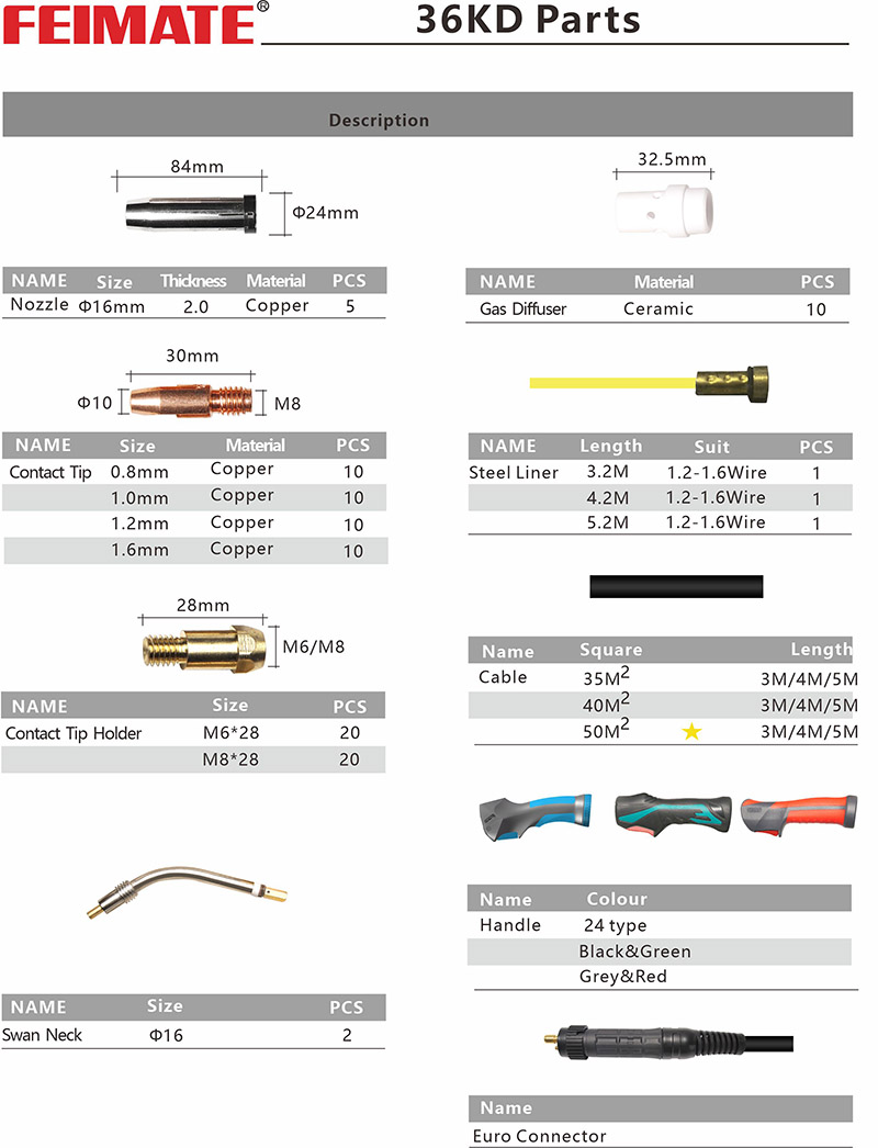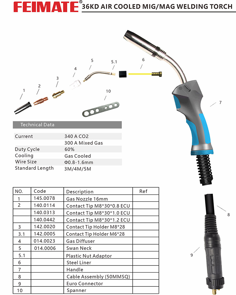 36KD MIG welding torch is widely used for 350A current MIG welding machine,welds for steel, carbon steel, aluminium material.